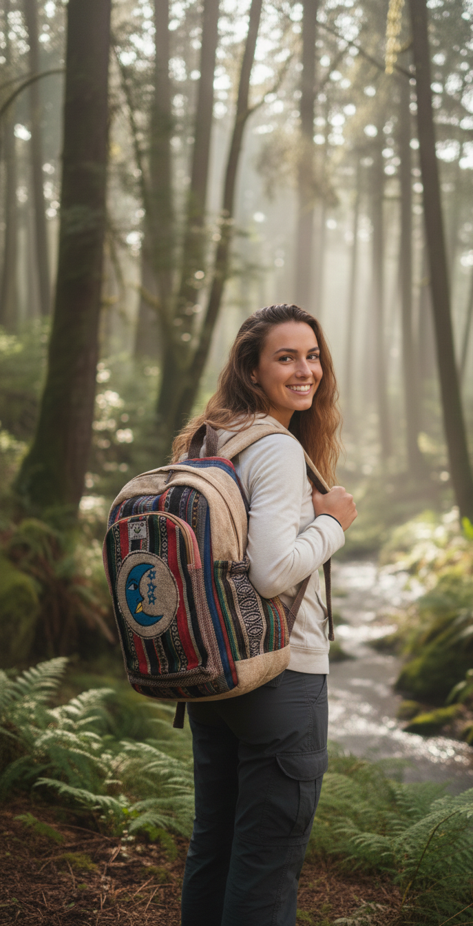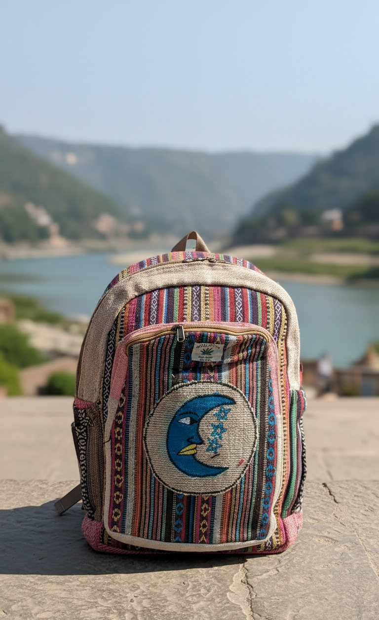 Pattern & Color: The main compartment uses a sophisticated "salt and pepper" grey hemp weave, providing a neutral balance to the colorful base.