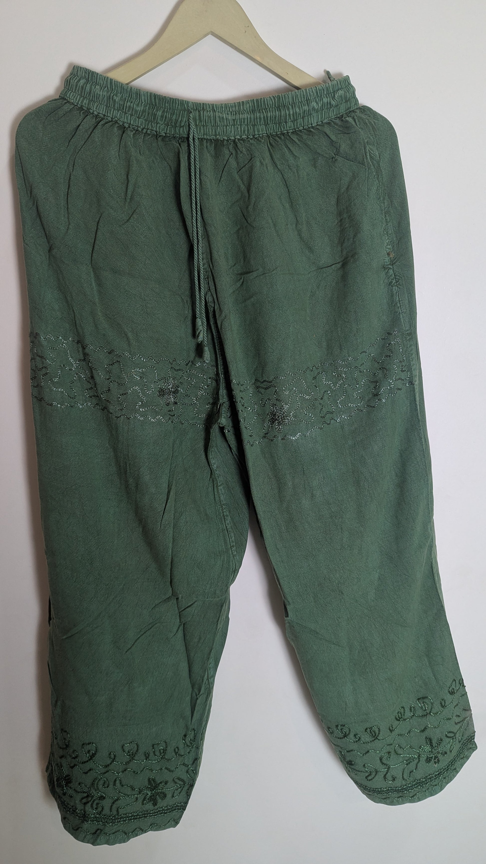 Features: Intricate tonal leg embroidery, adjustable drawstring waist, side pockets.